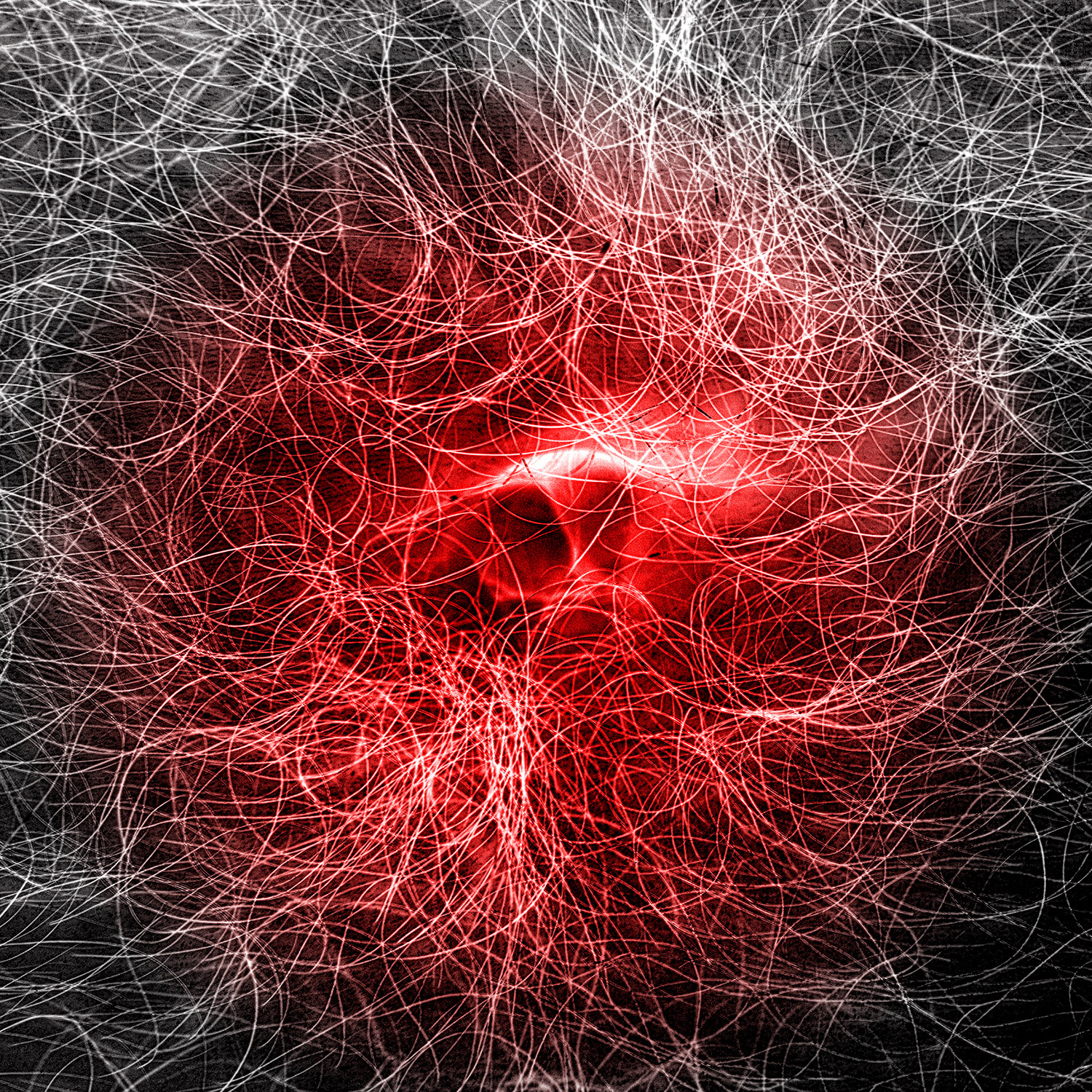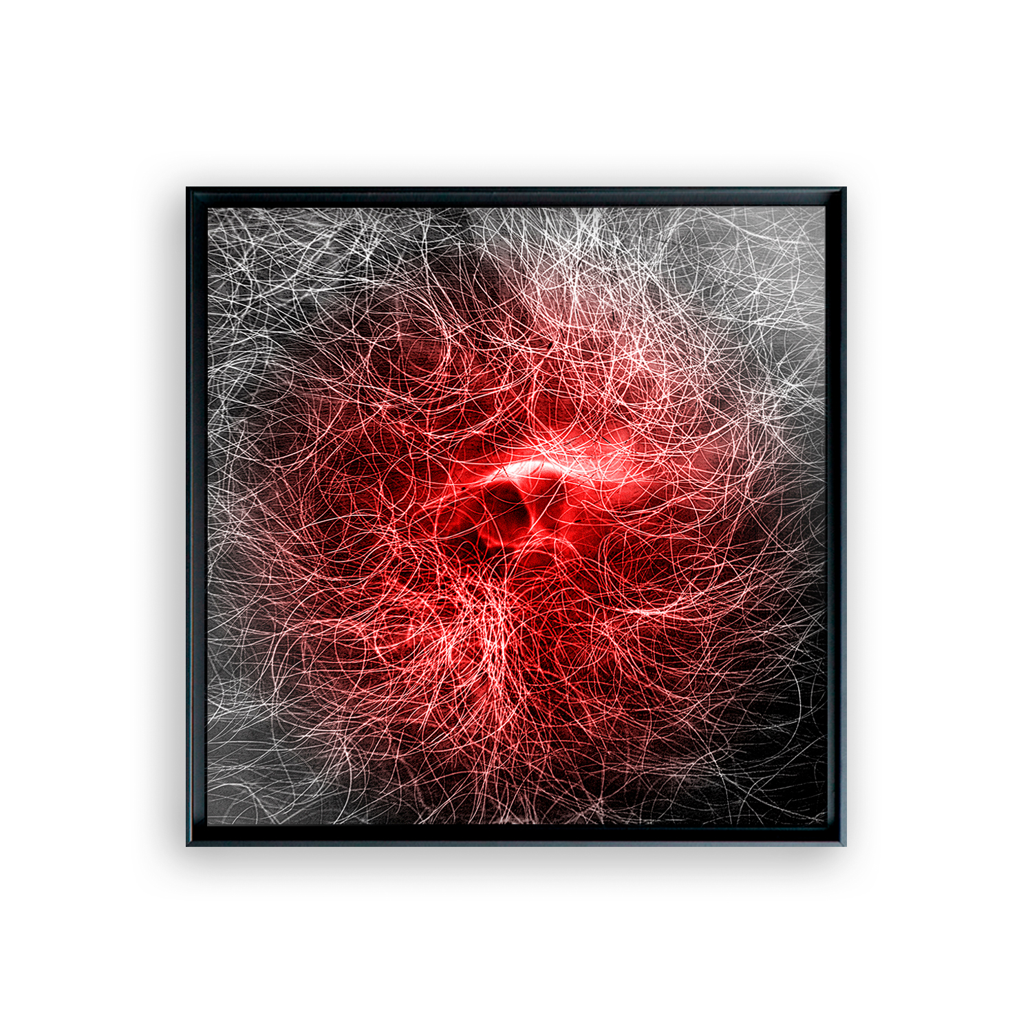 La femme donne la vie. A travers sa féminité elle est le début, le commencement de l’humanité. Mais quel en serait sa fin ? Telle est la question que pose Christophe Andrusin dans cette œuvre. En opposition, il y a l’homme. Sa brutalité, sa cupidité et son désir de posséder engendra-t-elle sa perte ? Cette image polysémique est à la fois une nébuleuse d’un système solaire collapsé, un réseau filaire en perpétuelle expansion ou encore un vortex organique dont son rouge incandescent annonce une fin proche…
