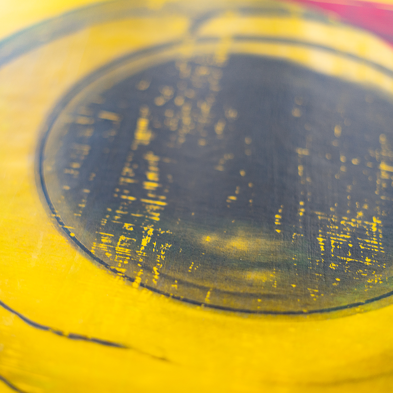 Franchissez les seuils dans l’infiniment petit et les distances ne seront plus tout à fait certaines. Vous êtes au-delà du femtomètre à moins d’un millionième d’un milliardième de mètre, une taille plus petite qu’un proton ou un neutron. Vous approchez alors inexorablement des frontières connues de la physique moderne, jusqu’à la mousse quantique. à travers la série «Bulles», Christophe Andrusin questionne la perception des dimensions et des couleurs. Dans un rapport de dualité, il oppose la densité de l’aplat avec la vibrance des couleurs juxtaposées et des matières superposées. Ainsi, il trouble, excite, perturbe la rétine de l’œil. Ses « Bulles » fonctionnent telles un vortex colorimétrique où la lumière peut soit jaillir ou être absorbée. Le photogramme et les textutres picturales utilisées se confrontent aux pigments éclatants pour offrir de nouvelles perspectives vibratoire de la couleur.