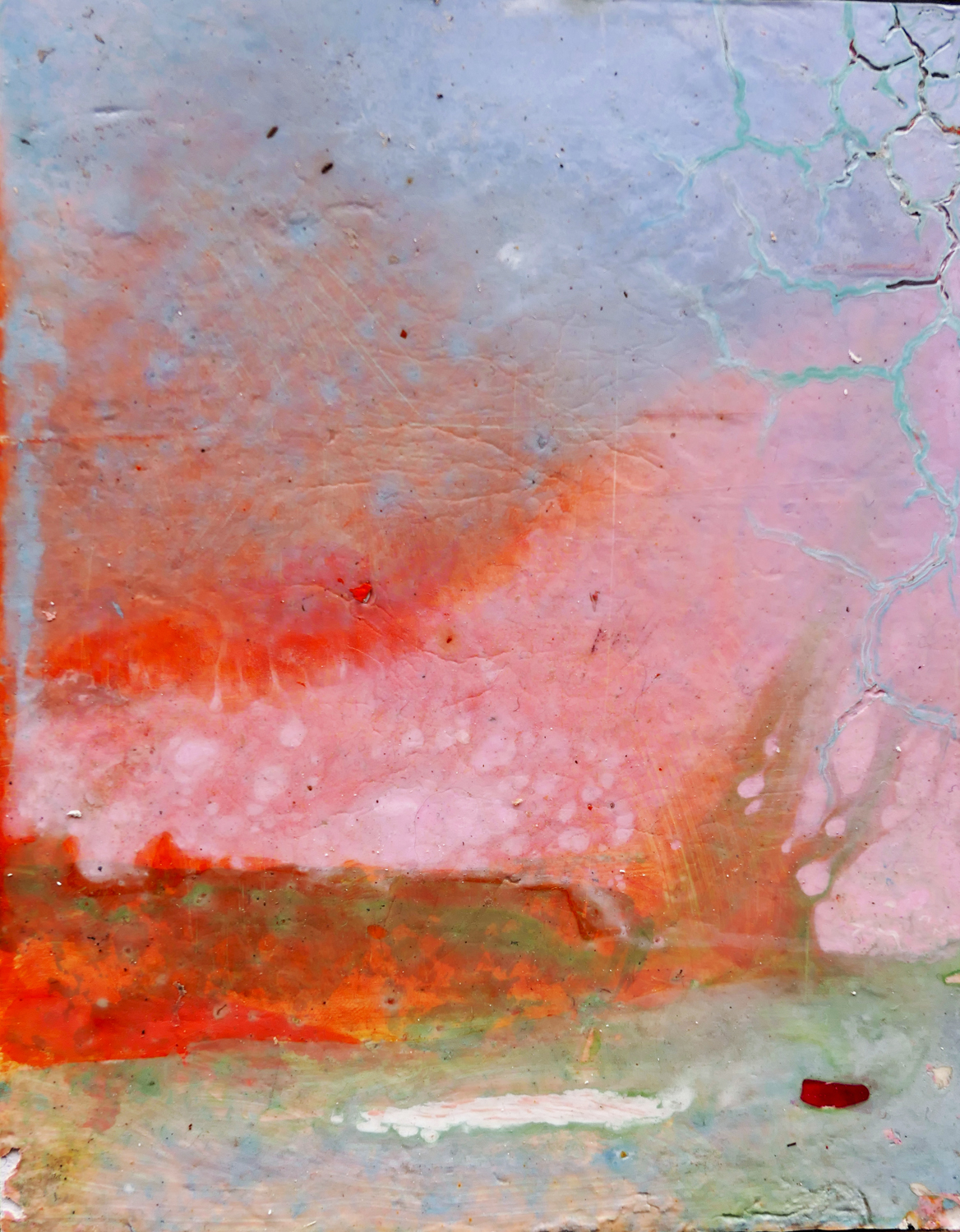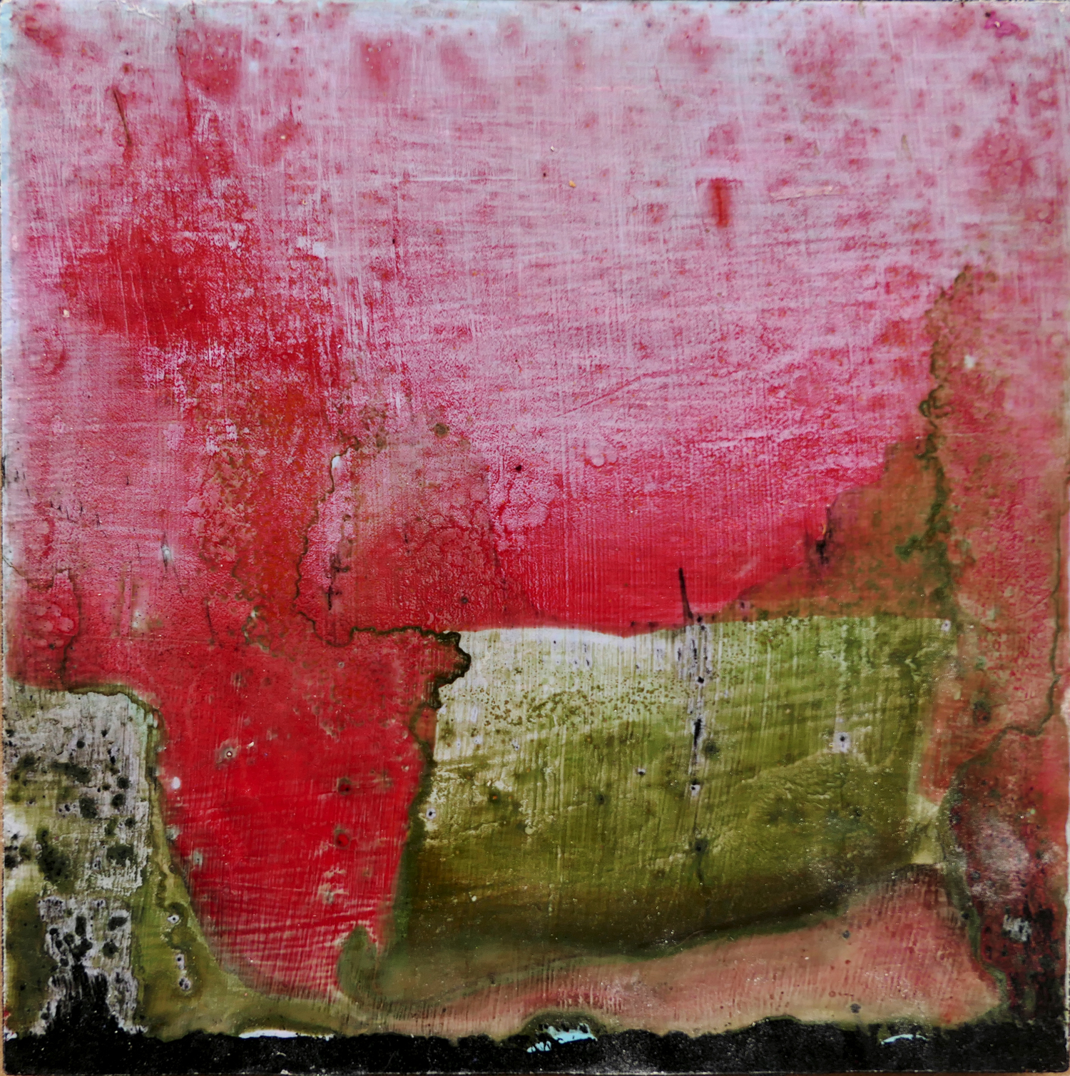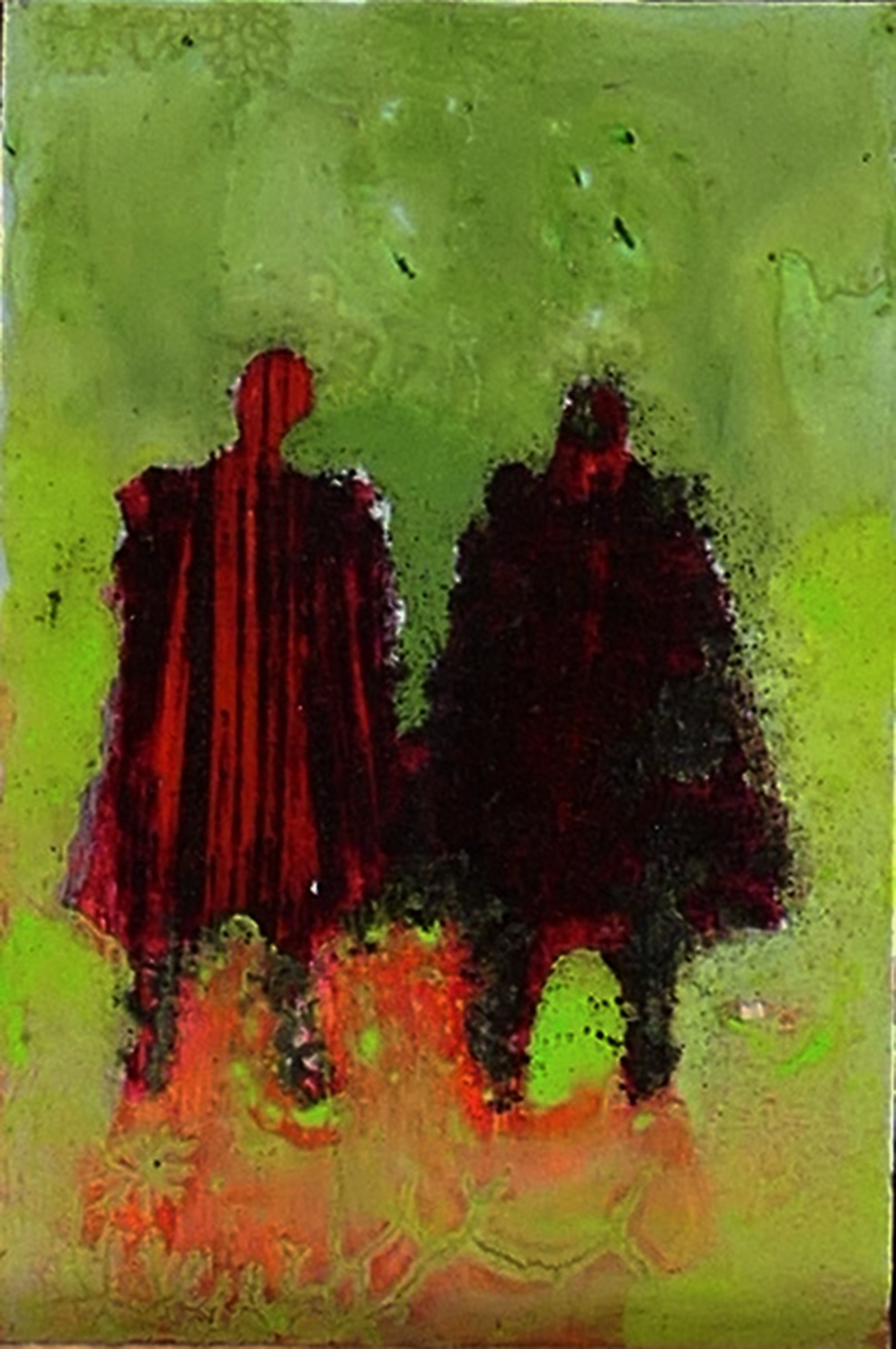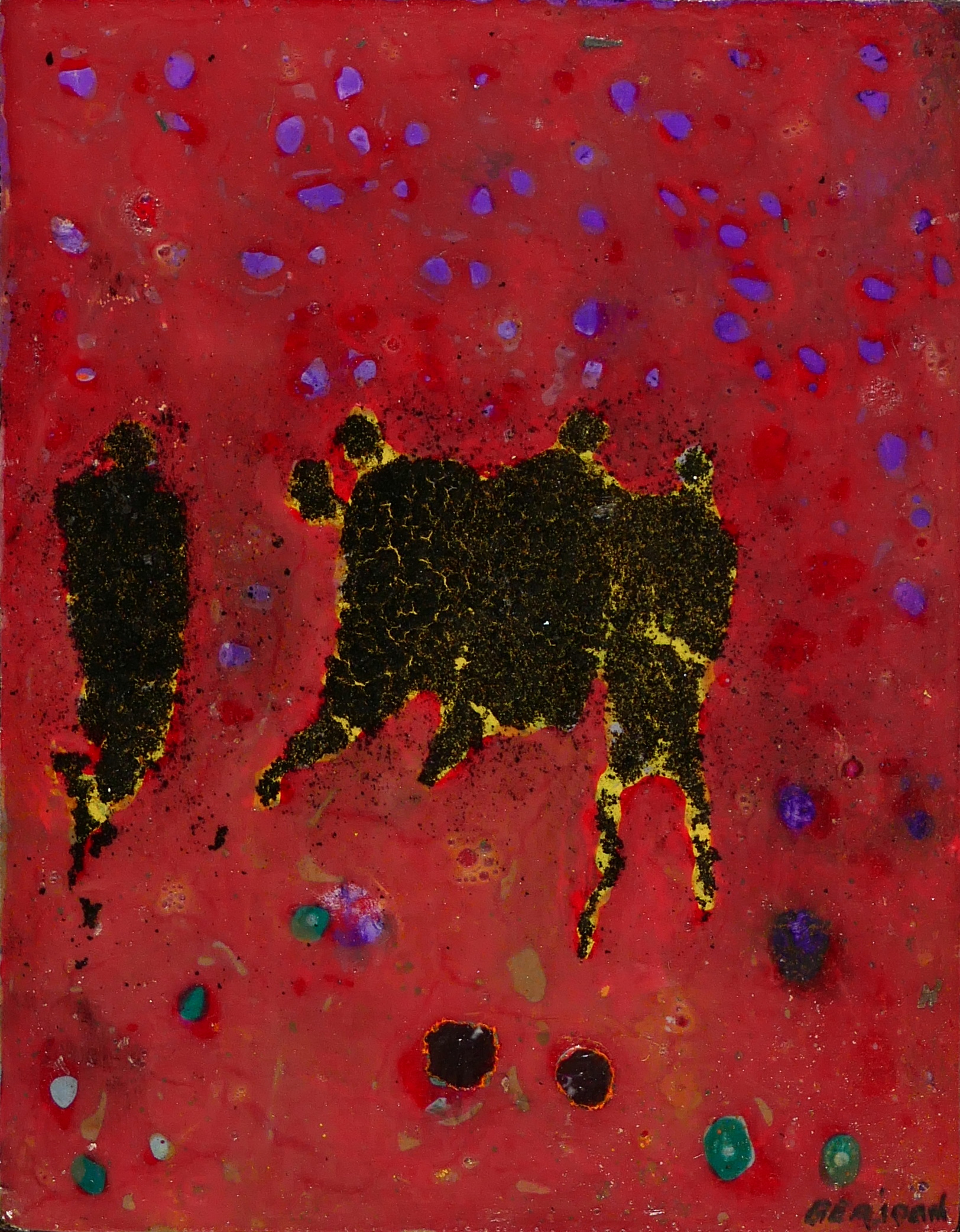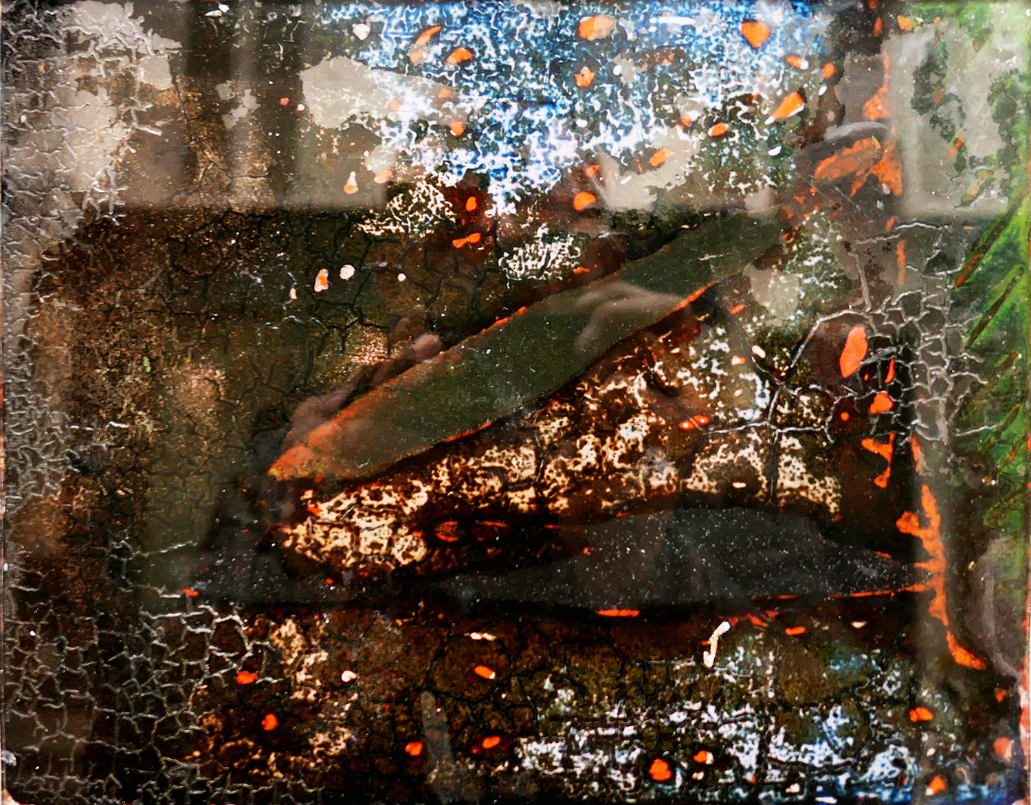 Je peins sur verre puis j’enlève la pellicule de peinture que je maroufle(colle) sur toile ou bois. Cette technique m’est particulière.