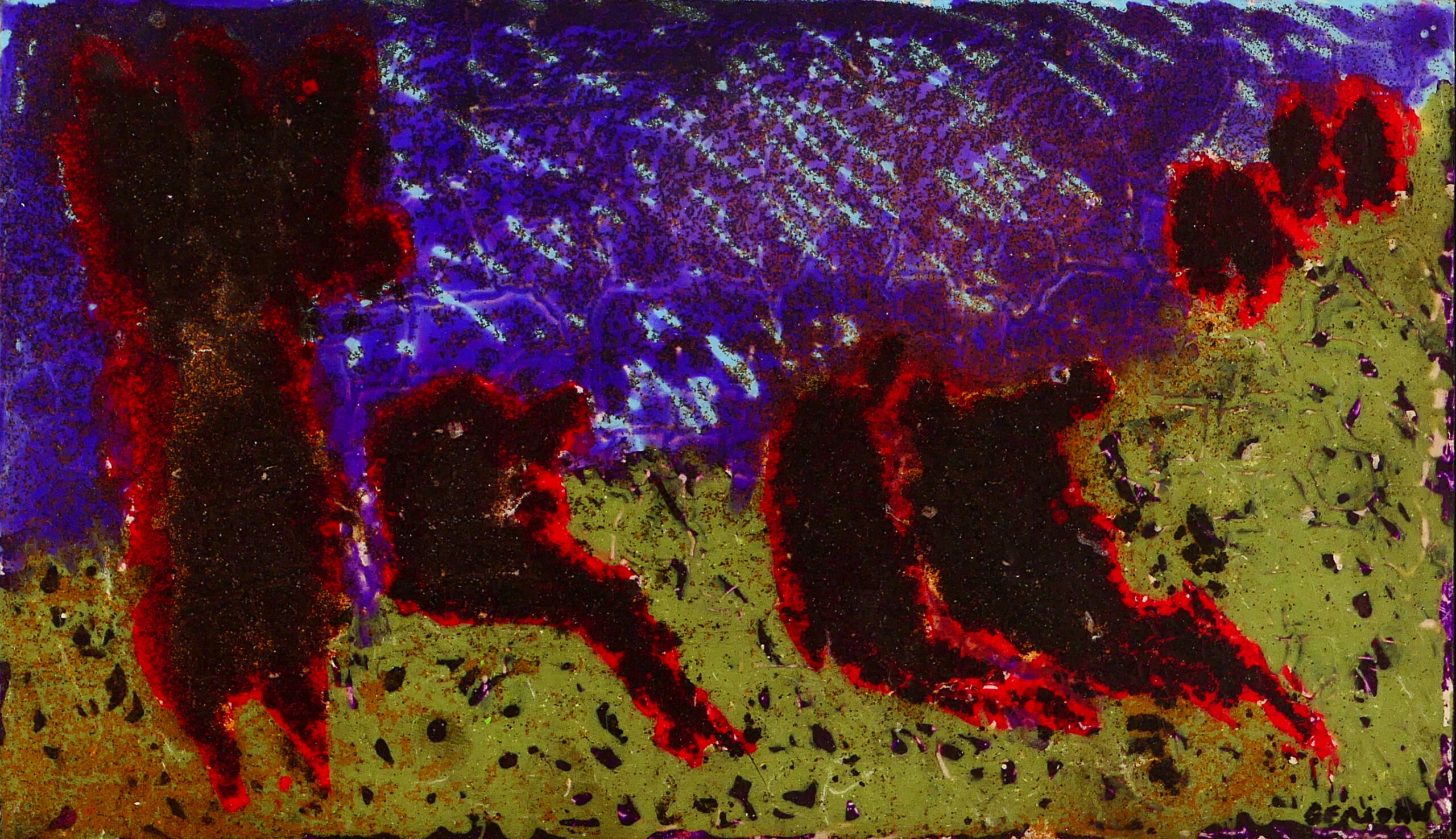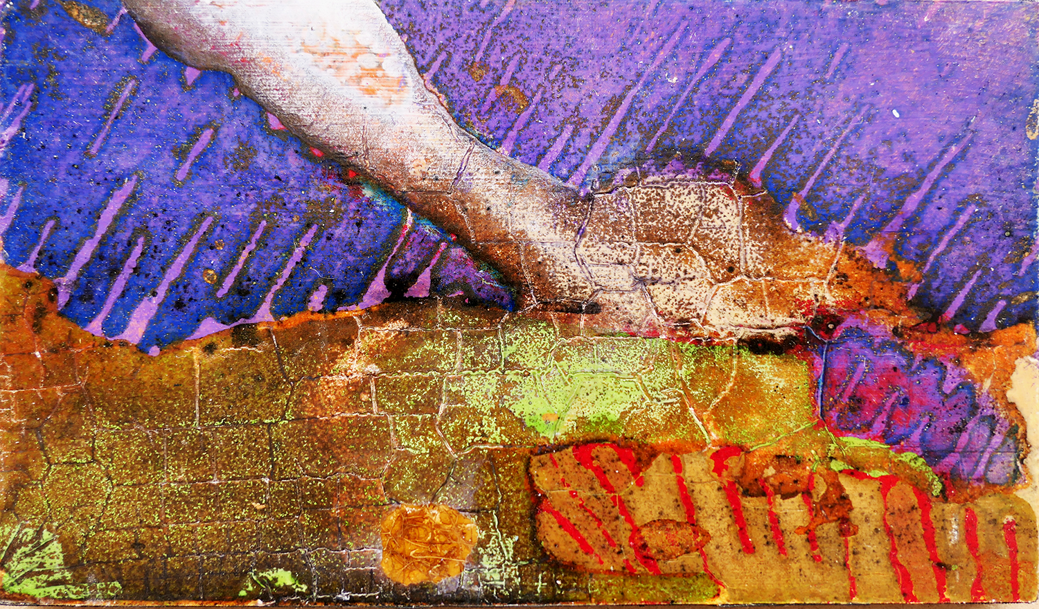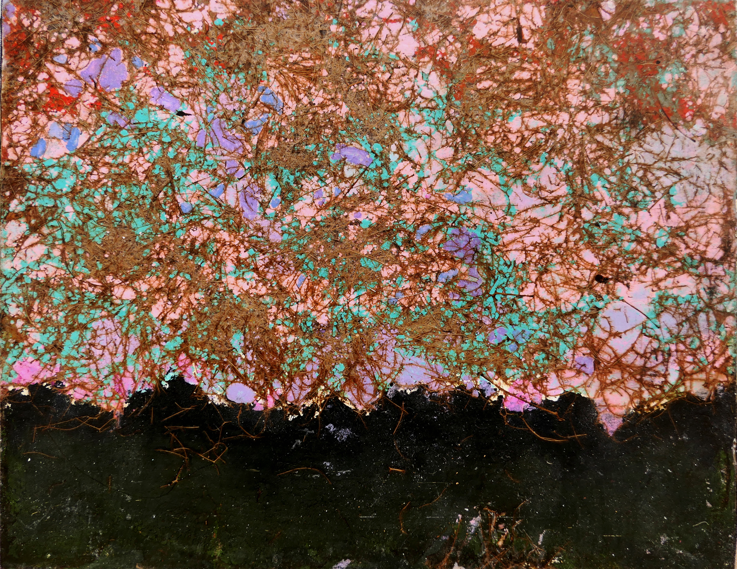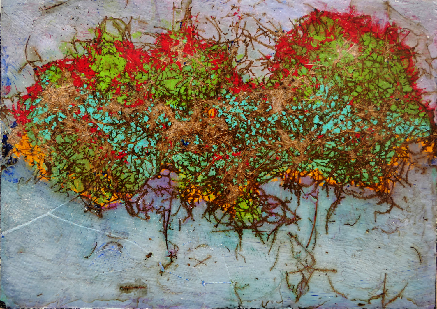 Je peins sur verre puis j’enlève la pellicule de peinture que je maroufle(colle) sur toile ou bois. Cette technique m’est particulière.