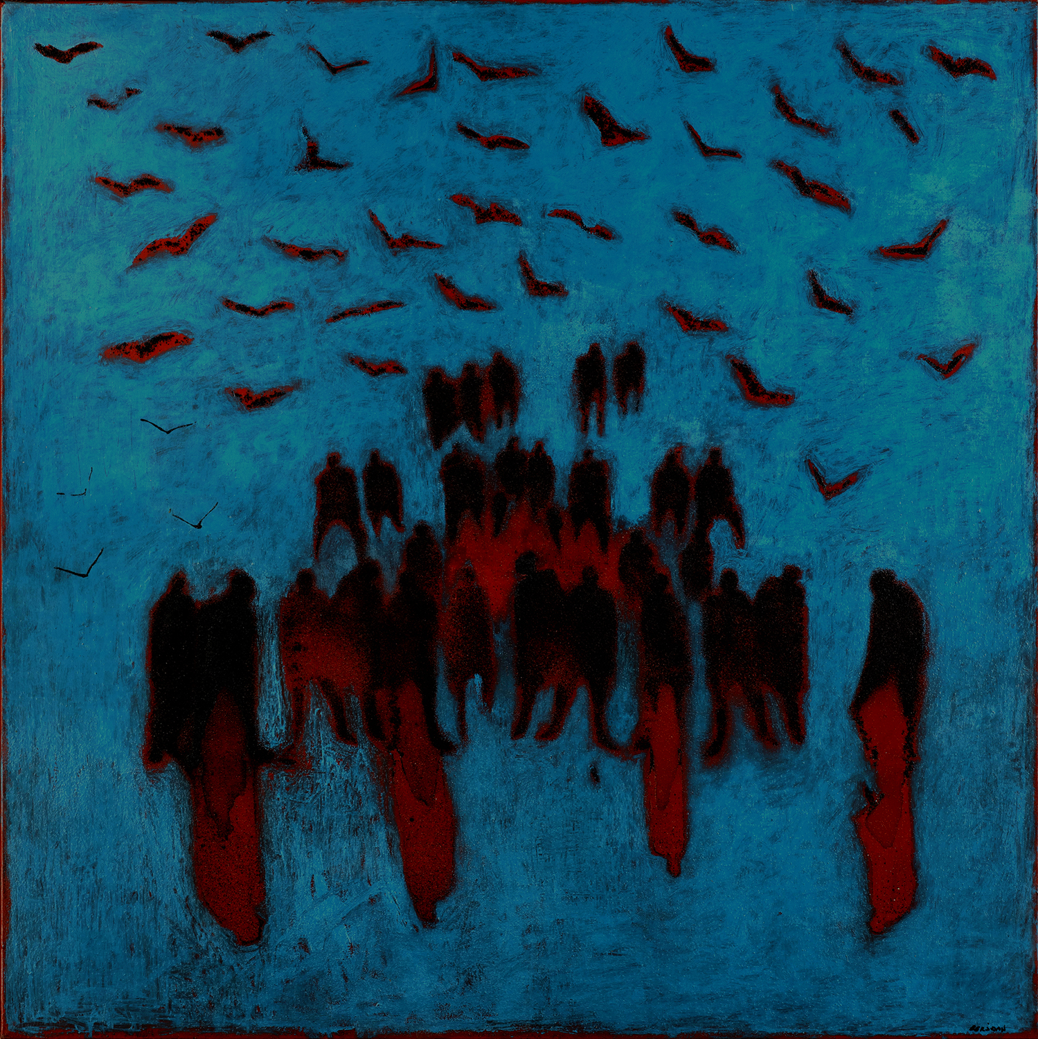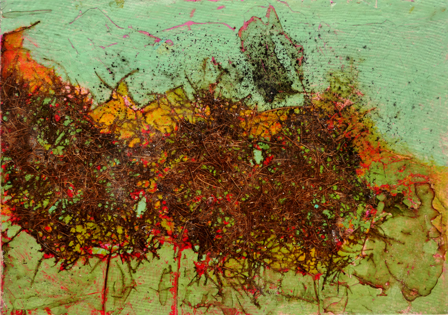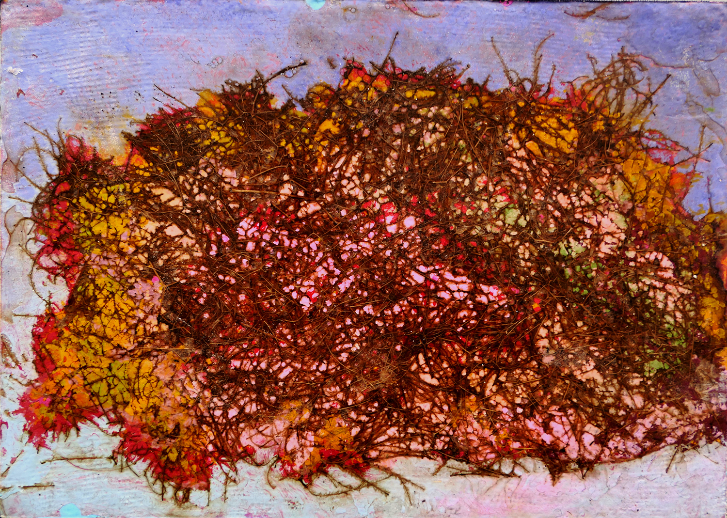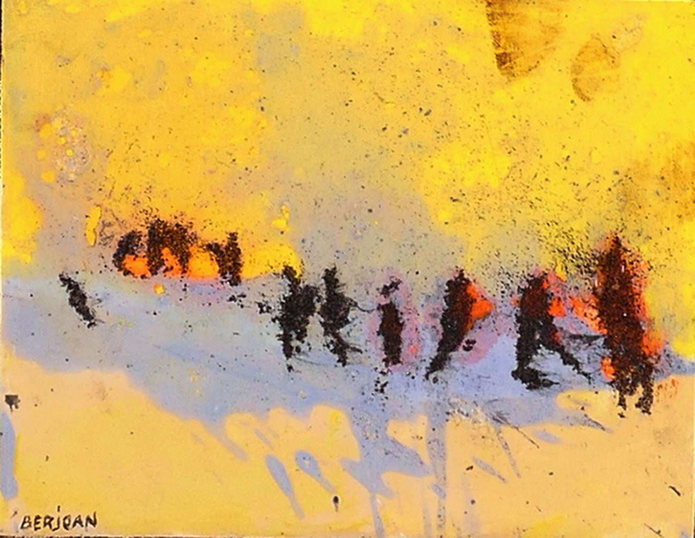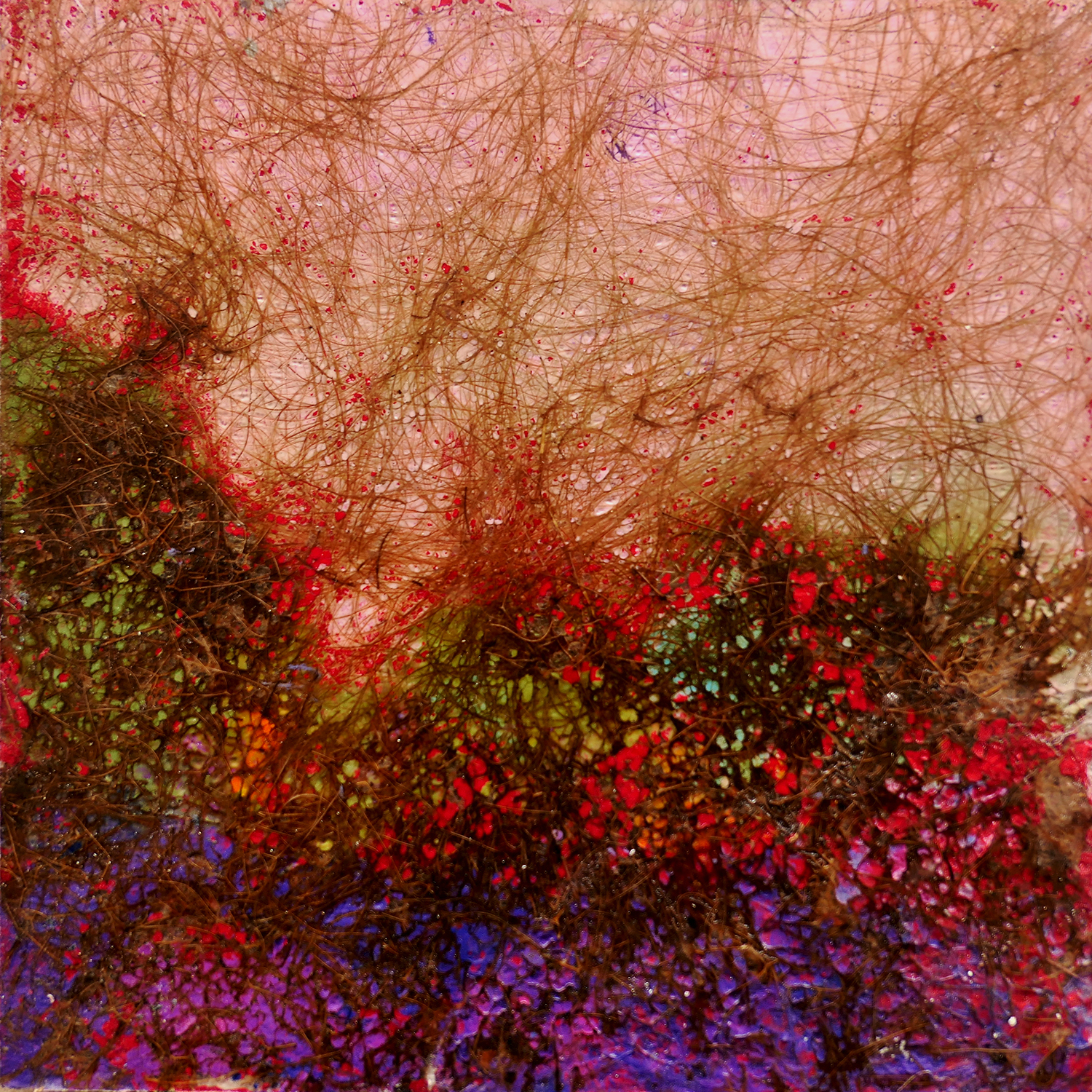 Je peins sur verre puis j’enlève la pellicule de peinture que je maroufle(colle) sur toile ou bois. Cette technique m’est particulière.