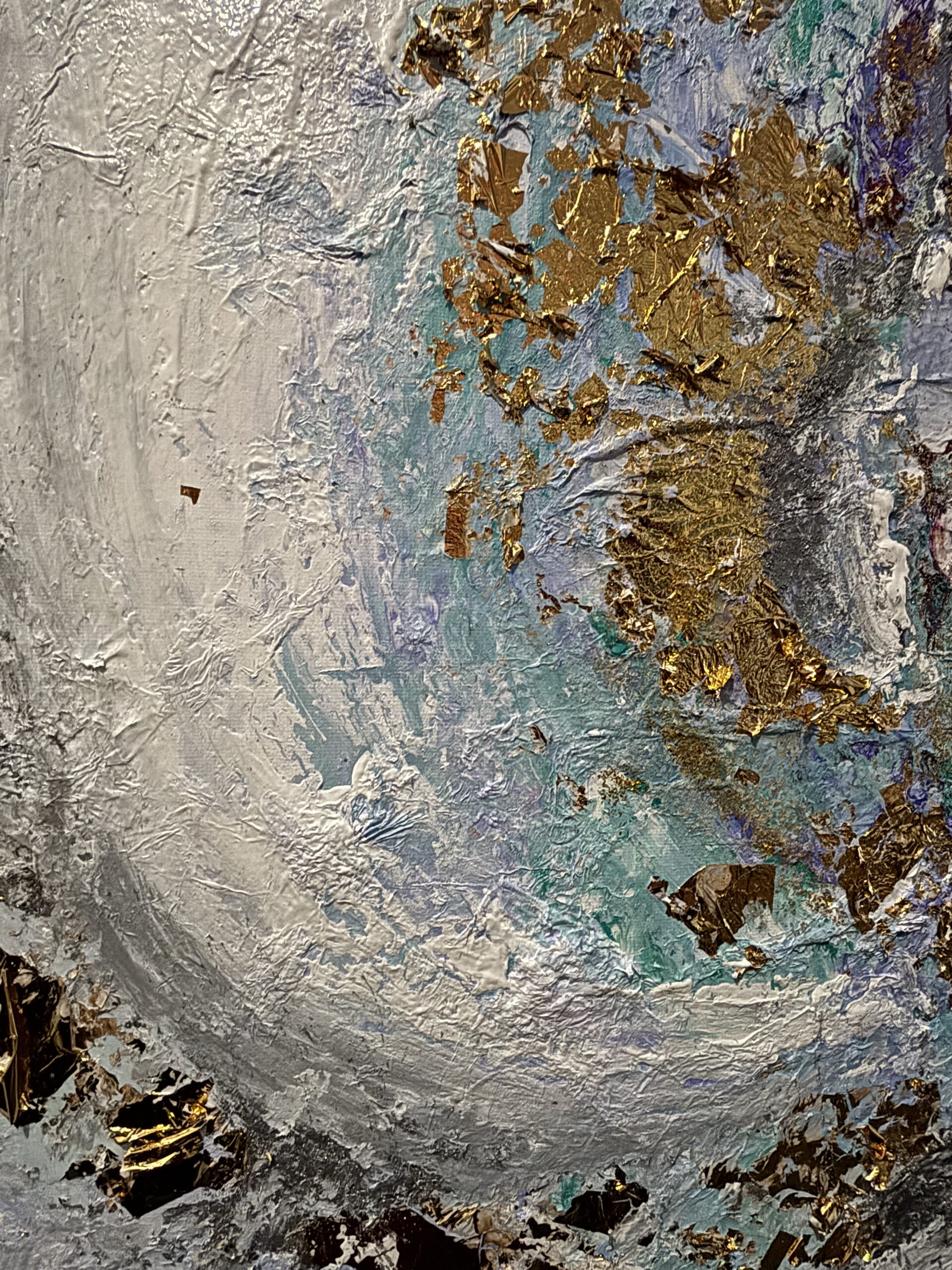 Les feuilles d’or, les strates de pigments et les textures telluriques traduisent la densité du son et sa capacité à purifier, à harmoniser, à reconnecter la matière à la lumière.