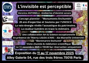 À la croisée de l’art et de la science, « L’Invisible est perceptible » révèle les vibrations secrètes des lieux et la mémoire acoustique de la matière. Chaque œuvre est née d’une expérience sonore précise — crypte, grotte, temple, ou salle des fêtes du Palais de l’Élysée — où la voix de Veronica Antonelli dialogue avec l’espace, en capte la résonance et la restitue sous forme picturale.
