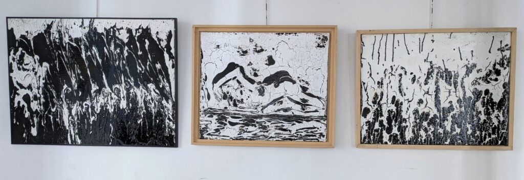 Les terres (ocres rouges, jaunes, …argiles, Kaolins, oxydes) sont importantes car elles gardent la trace du passage ou de la présence de l’être humain. D’origine fossile et pétrolifère le goudron, bitume, asphalte, nous le trouvons partout et déplorons son utilisation abusive et dévastatrice. Cette matière informe combinée à sa noirceur, je ne l’associe pas à l’huile, mais à l’acrylique. (..) Le résineux et l’aqueux s’entendent et entrent en osmose avec l’état visqueux du bitume, qui ne les dévorera pas.