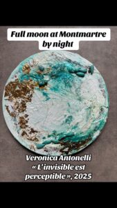 « L’Invisible est perceptible » À la croisée de l’art et de la science, « L’Invisible est perceptible » révèle les vibrations secrètes des lieux et la mémoire acoustique de la matière. Chaque œuvre est née d’une expérience sonore précise — crypte, grotte, temple, ou salle des fêtes du Palais de l’Élysée — où la voix de Veronica Antonelli dialogue avec l’espace, en capte la résonance et la restitue sous forme picturale. Ces peintures, véritables empreintes vibratoires, matérialisent ce que l’oreille ne perçoit pas mais que le corps ressent : les ondes, les fréquences, les harmoniques. Les feuilles d’or, les strates de pigments et les textures telluriques traduisent la densité du son et sa capacité à purifier, à harmoniser, à reconnecter la matière à la lumière. Fruit d’une collaboration depuis trois ans entre Veronica Antonelli, artiste lyrique et plasticienne, et Thierry Legou, chercheur en acoustique au CNRS Aix-Marseille, cette exposition explore le lien intime entre voix, vibration et espace. NB : Le 11/11/25 a 15H30 une première à Montmartre : visite chantée et médiation scientifique. Veronica Antonelli et Thierry Legou allient leur expertise pour vous proposer une expérience sensible où la science éclaire le sacré, et où l’art rend visible l’invisible. (Places limitées) www.veronicaantonelli.com (Exposition art & science – “L’invisible est perceptible”, Galerie Alley, Montmartre, du 11 au 17 novembre 2025)Sous la clarté mystique de la pleine lune, Montmartre se révèle dans son souffle secret. Les nuances turquoise et les éclats d’or évoquent la lumière lunaire qui caresse la pierre et fait vibrer les âmes du lieu. Les fragments de partitions rappellent les chants portés par le vent nocturne, tandis que les matières texturées traduisent la résonance invisible entre la voix et la colline. Cette œuvre capture l’instant suspendu où la lune devient témoin d’un dialogue entre ciel, terre et vibration humaine, un hommage à la beauté silencieuse et à la magie acoustique de Montmartre endormie. Un clin d’oeil à la visite nocturne du quartier bohème de Montmartre que propose la cantatrice du Sacré-coeur au Moulin rouge « Montmartre enchanté by night »Inspirée par les roches rouges de Sedona, cette œuvre capture la mémoire acoustique de la terre mémoire de milliards d’années, là où les vibrations minérales répondent aux fréquences de la voix humaine a capella, en 2005. L’instant magnétique qui a impulsé la recherche si spécifique sur l’identité sonore des monuments révélée grâce à la voix de la soprano surnommée en 2012 par la presse « la voix du patrimoine ». Une question : arriverai- je à reconnaître un monument par son acoustique singulière cet espace invisible devenu vibration qui devient perceptible par l’ouïe et par résonance corporelle ? Entre or, rose et pourpre, la matière semble chanter : les partitions enchâssées dans la texture évoquent l’union du souffle et de la pierre. Résonance de Sedona témoigne de l’alchimie entre la voix et la nature, révélant l’énergie vibratoire enfouie dans la roche, source d’équilibre et de puissance intérieure.« Cœur Tellurique » Inspirée de l’acoustique de la salle des fêtes du Palais de l’Élysée, « Cœur Tellurique » explore la vibration majestueuse du lieu où résonne l’histoire. Les strates d’or, d’argent et de lumière traduisent la puissance du son qui circule sous les ors de la République et se propage dans la mémoire des murs. Au centre, un vortex vibrant symbolise le souffle premier, là où la voix agit comme un instrument de purification. Par ses harmoniques, elle effectue des nettoyages sonores, libérant les charges mémorielles pour rétablir la résonance originelle entre matière, esprit et espace. Cette œuvre réunit art et science, dans une quête où la vibration devient langage et la lumière, mémoire du son.Né d’une recherche menée en juin 2024 par le chercheur acousticien Thierry Legou (CNRS) et la soprano Veronica Antonelli, ce projet explore l’interaction entre la voix humaine et les oiseaux. Cette œuvre matérialise l’impact invisible du chant sur le vivant : les feuilles d’or incarnent les oiseaux et la lumière leurs réponses, tandis que l’onde bleue représente la vibration vocale de la soprano, perturbant et réorganisant la communication naturelle des oiseaux par écho-localisation. Les textures aériennes, les poudres turquoise et vert émeraude traduisent la propagation du son dans l’air, au cœur du Jardin Saint-Vincent, lieu préservé, environnement de résonance naturelle à Montmartre. Le mouvement spiralé exprime la circulation de l’énergie entre ciel et terre, un dialogue sensible entre souffle humain et chants d’oiseaux. Inscrite dans le cycle « L’invisible est perceptible », cette œuvre rend visible la vibration du son et la connexion intime entre art, science et nature.“L’éveil de la pierre” /repérages acoustiques Notre Dame de Paris. Cette œuvre dégage une énergie de spirale vibratoire, une résurrection du son et de la lumière à travers la matière; avec ses roses profonds, ses textures mouvantes et ses éclats d’or qui évoquent la réverbération d’une voix sacrée. “La voix a cappella en mouvement dans Notre-Dame de Paris”. Dans le silence endormi de Notre-Dame de Paris, la voix a cappella circule telle une onde vivante qui accueille une présence bienveillante propice à la méditation. Dans le silence endormi de la cathédrale devenue refuge, la voix de a soprano a cappella circule comme une onde vivante. Chaque note réveille la mémoire acoustique du lieu, ré-active l’espace en sommeil et révèle sa résonance profonde. Par la vibration réverbérée, l’architecture devient instrument : la pierre répond, le souffle se propage, l’espace s’unit au son. La cantatrice